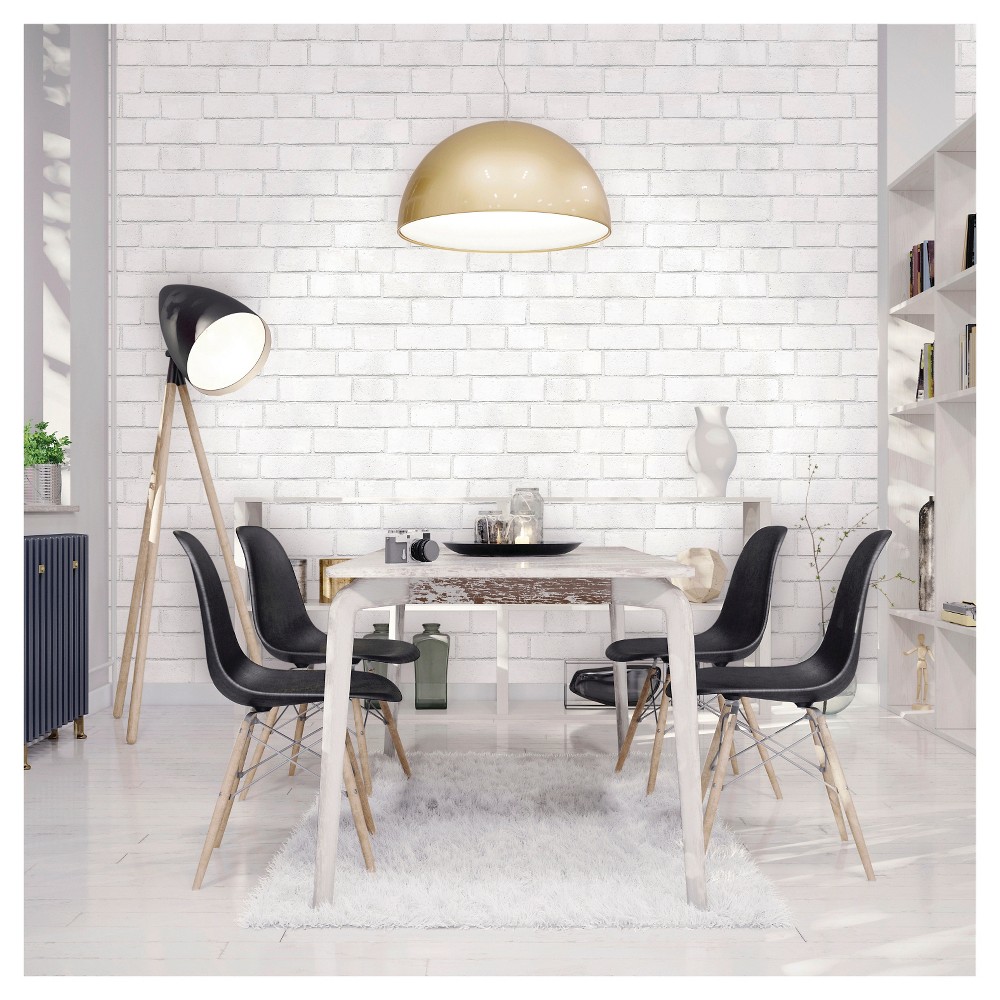 The product is described as “Devine Color Prints and Patterns textured Brick White is a peel-and-stick, removable wall and surface covering that is easy to apply, reposition, and remove. Simply peel and stick onto recommended surfaces.” No fear of permanent wallpaper removal as in the past – this is easily removed.